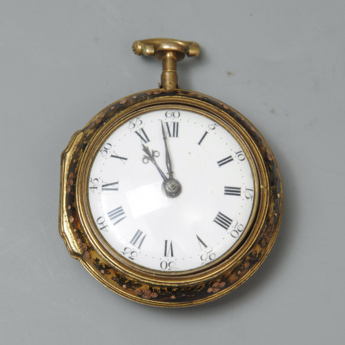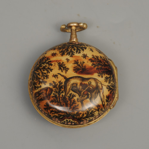 The enamel dial to the calendar beautifully painted with maidens both dials set within a finely engraved ormolu plate.