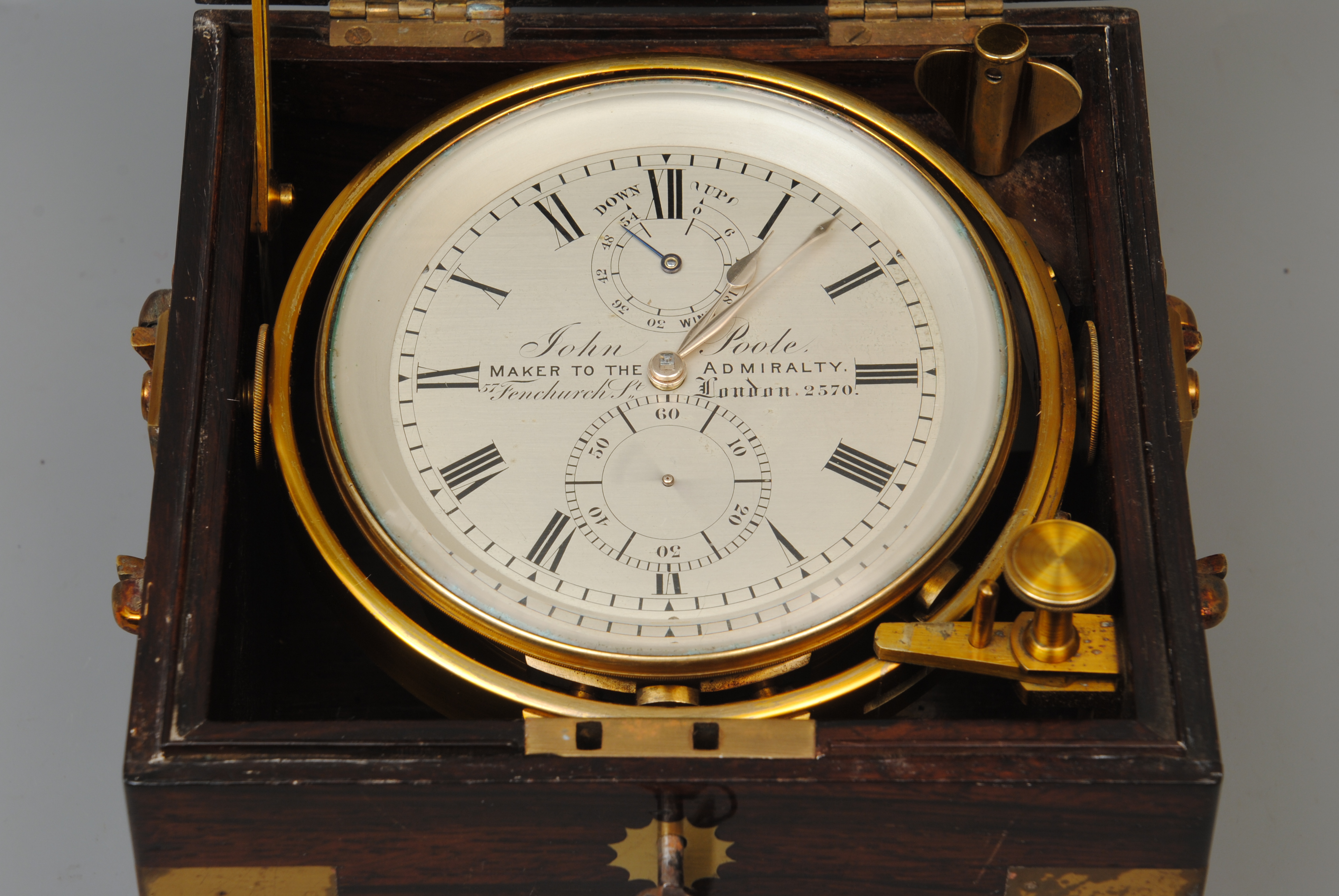 A fine mid 19th century 2 day marine chronometer by John Poole, London, who was regarded as one of the finest chronometer makers of his period. This example has his auxiliary compensation, allowing it to be far more accurate in colder climates.