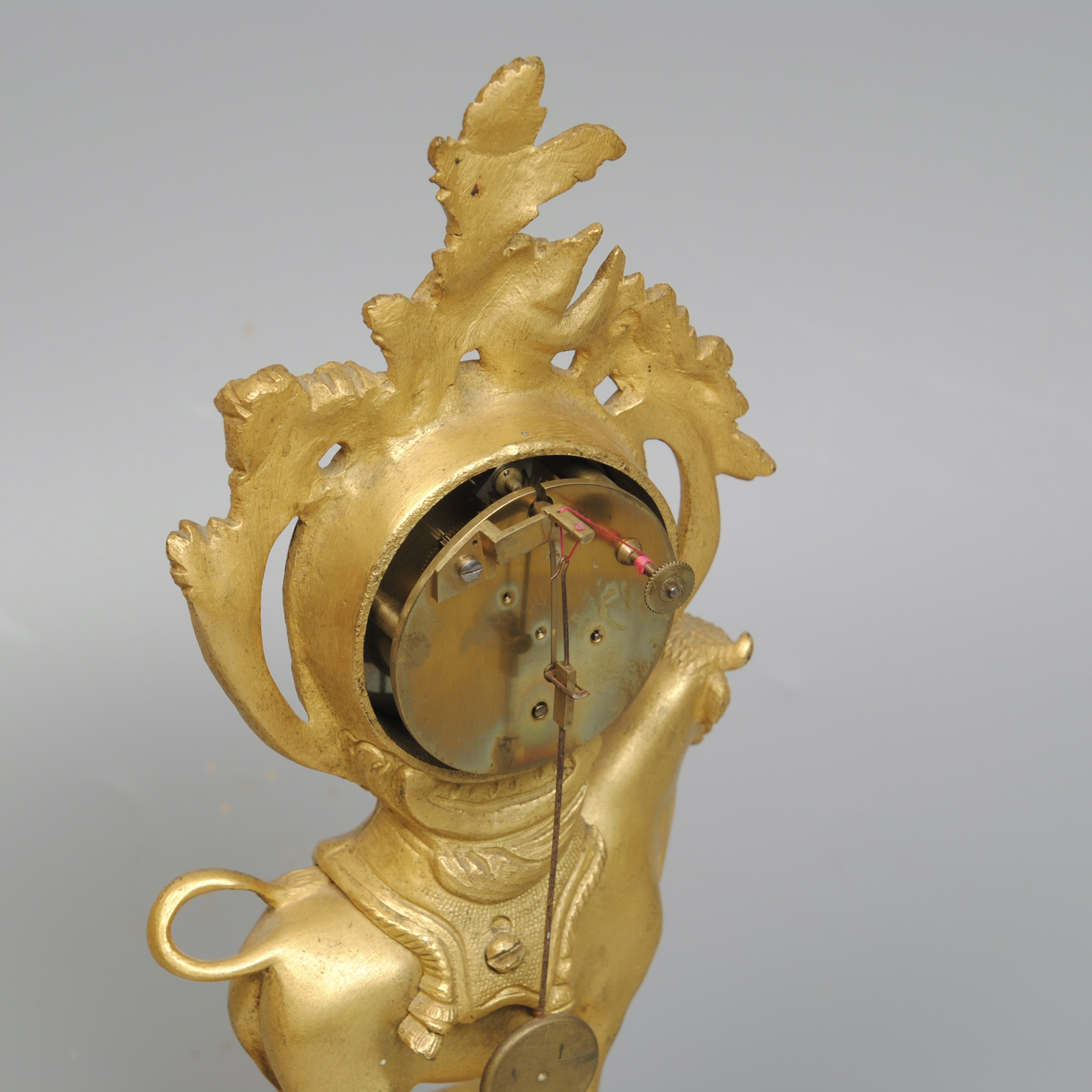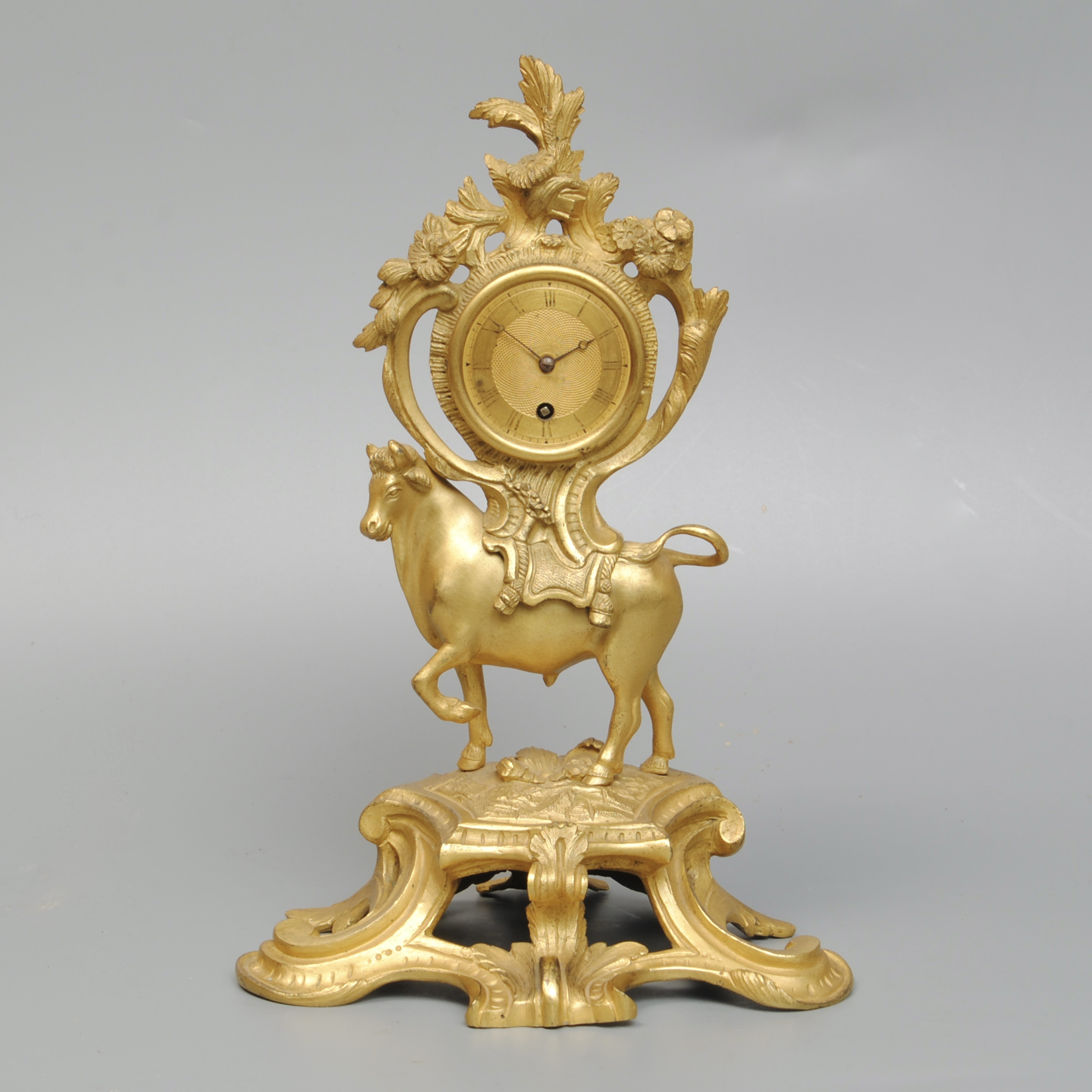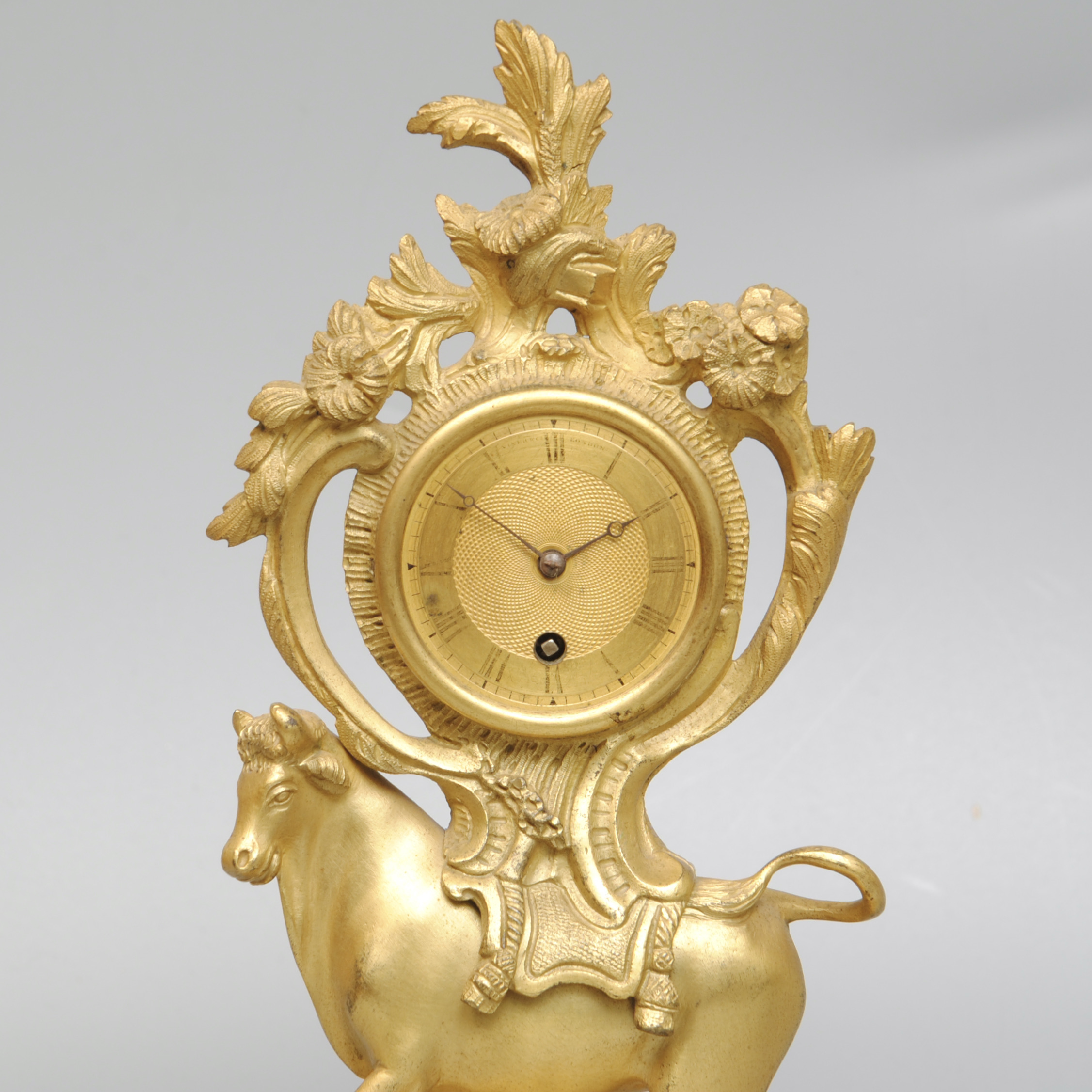 A Regency period Ormolu clock in the form of a bull mounted with the clock on his back in schools and flowers, standing on a rococo base.