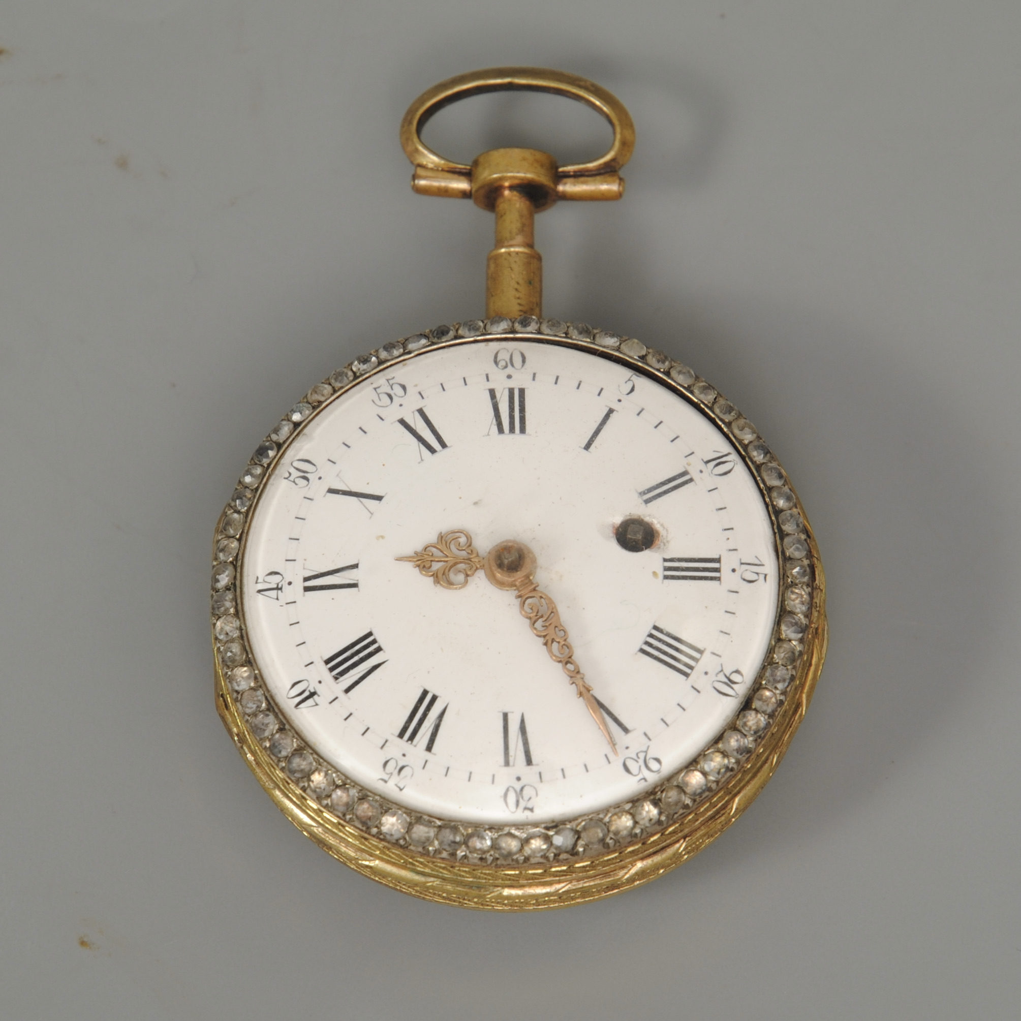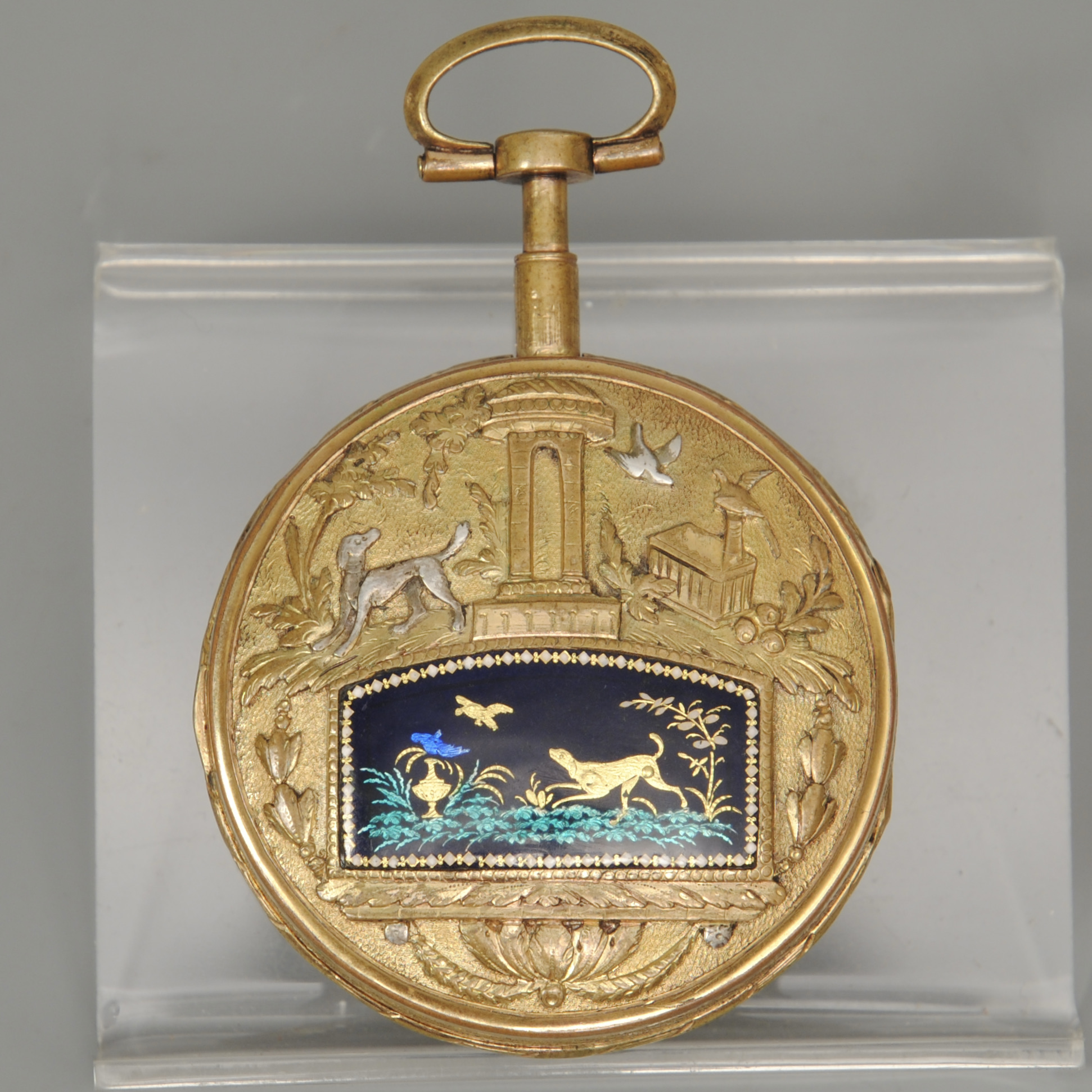 An early 19th century Palais Royal verge pocket watch in a gilt repousse case with a fine enamel hunting scene to the back.
