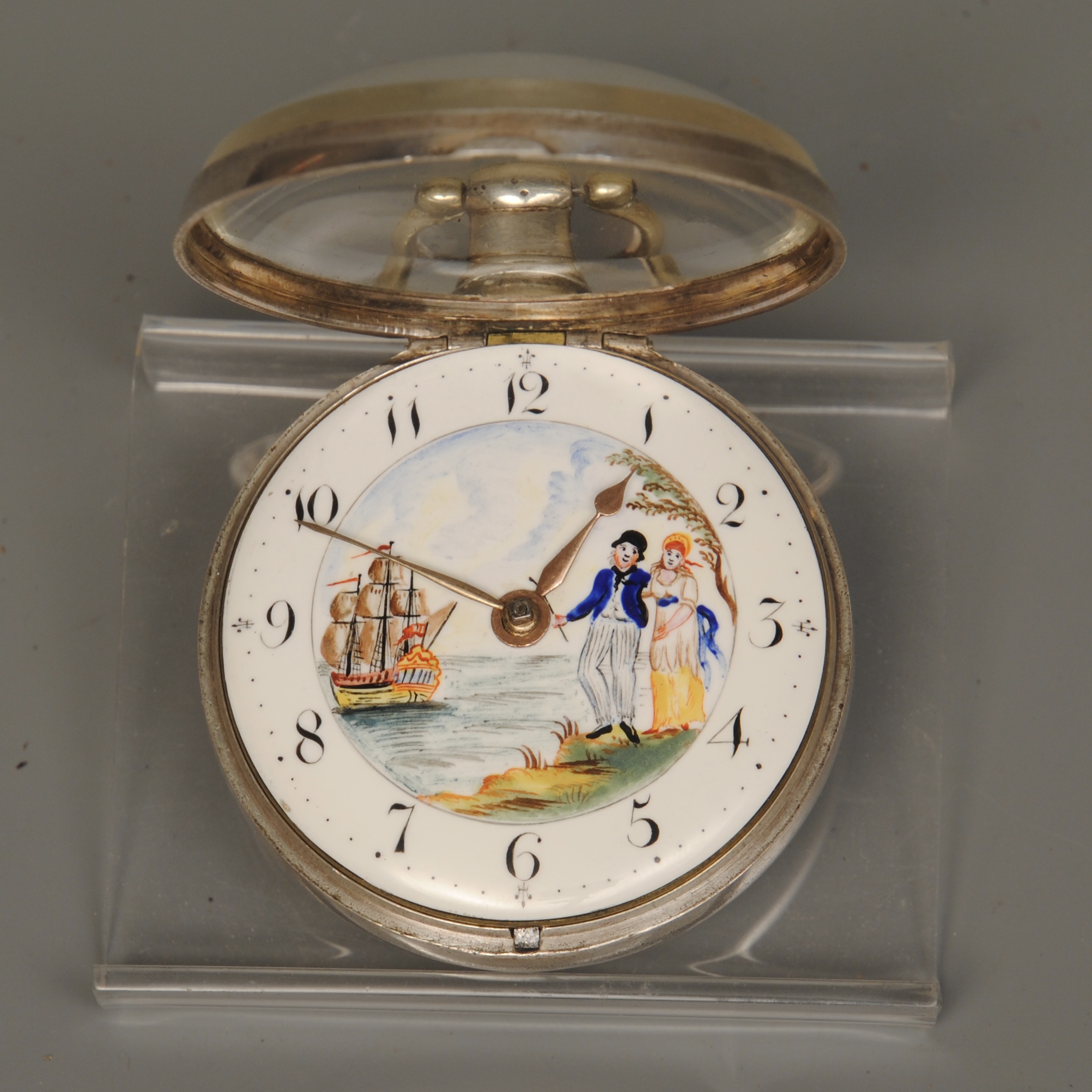 - Liverpool painted dial pocket watch with ship leaving port and a couple