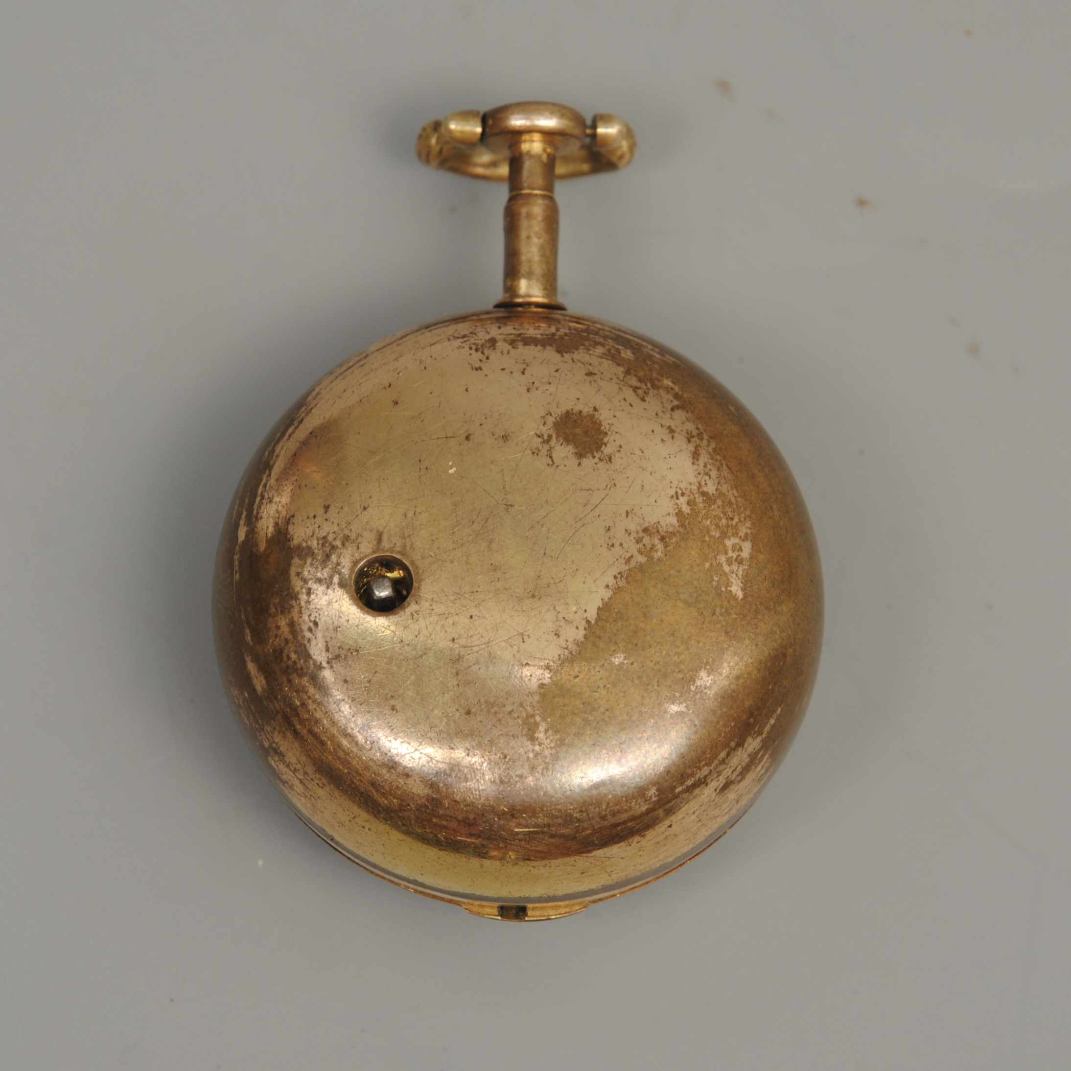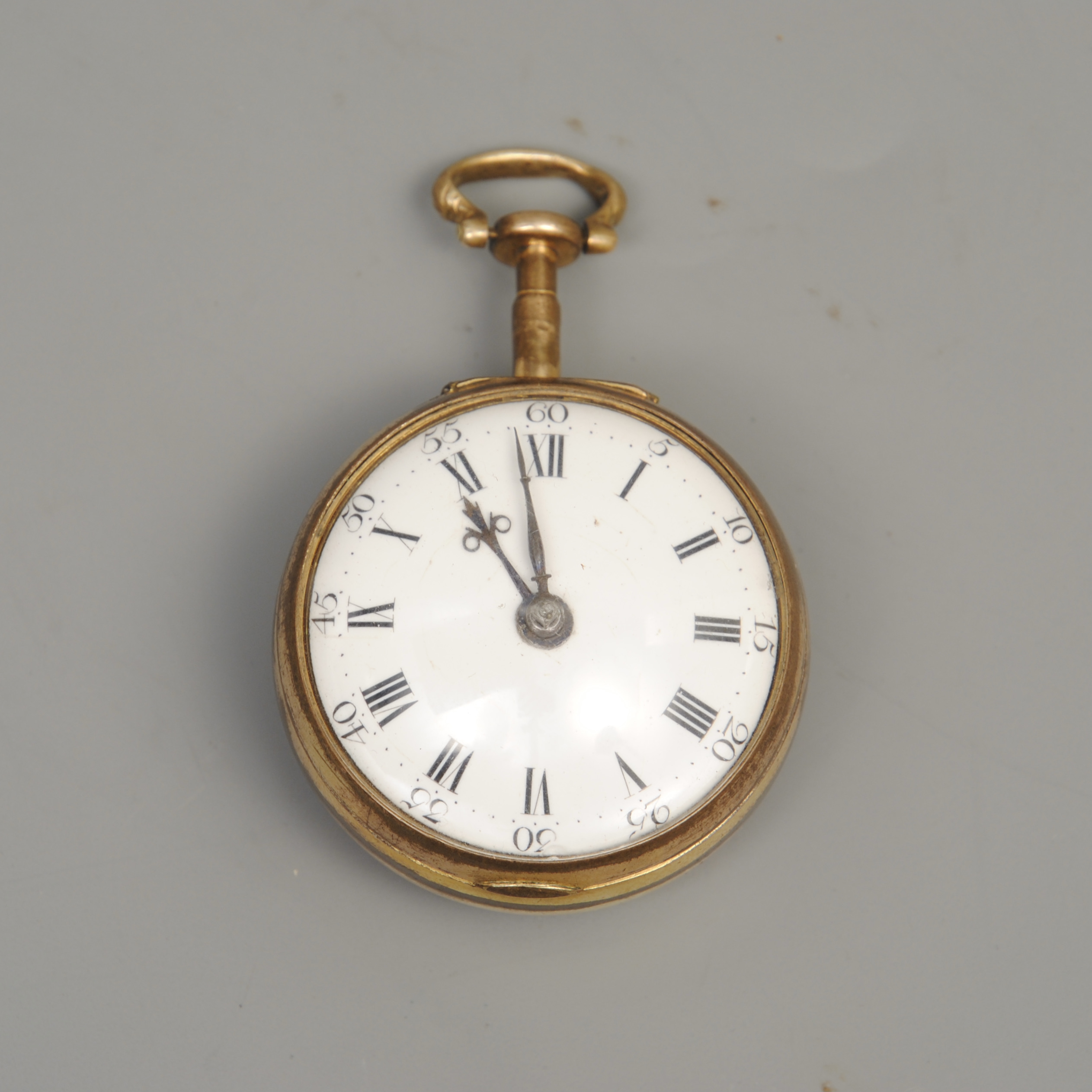 An enamel dial, pair cased verge fusee pocket watch signed R Blossom on the gilt movement with square pillars