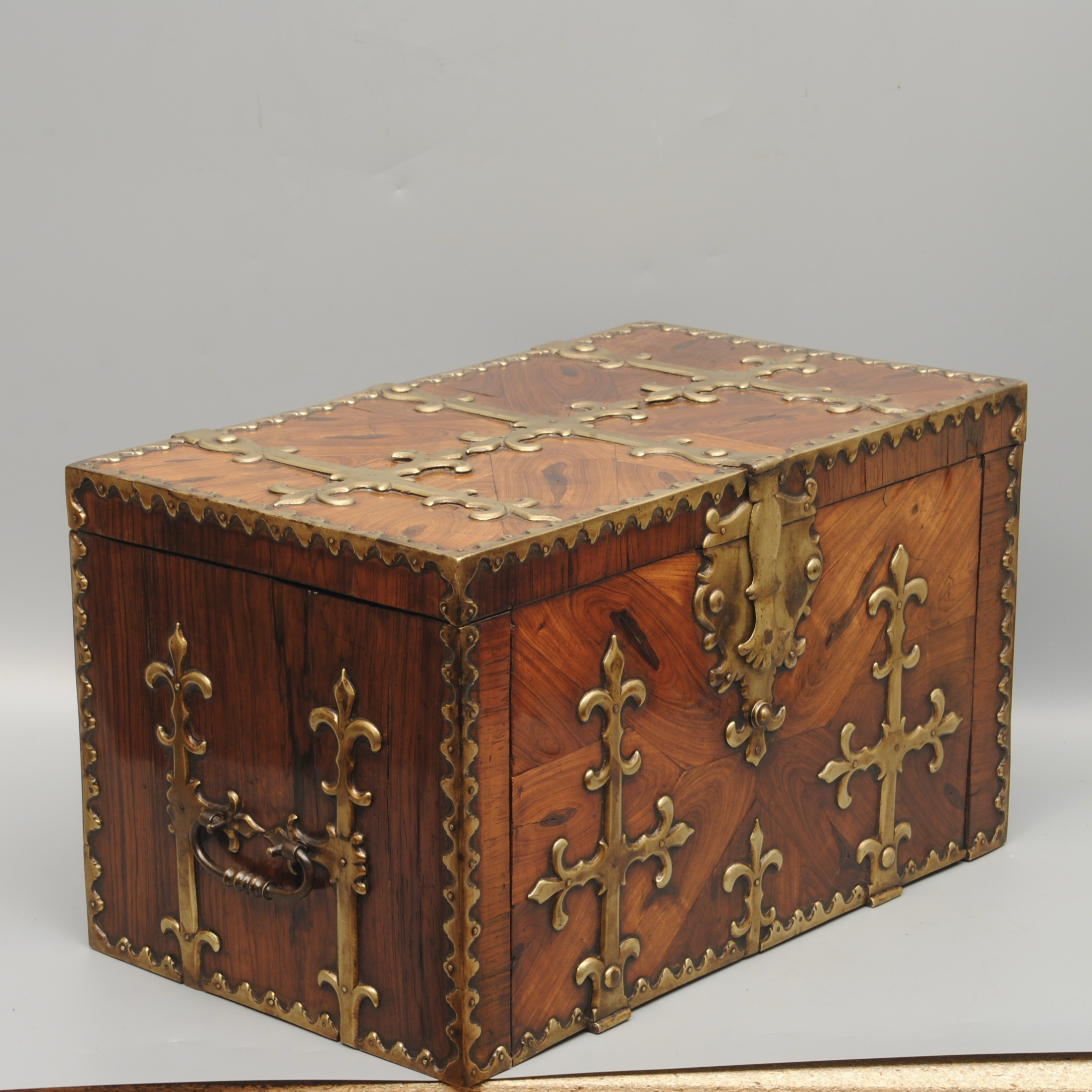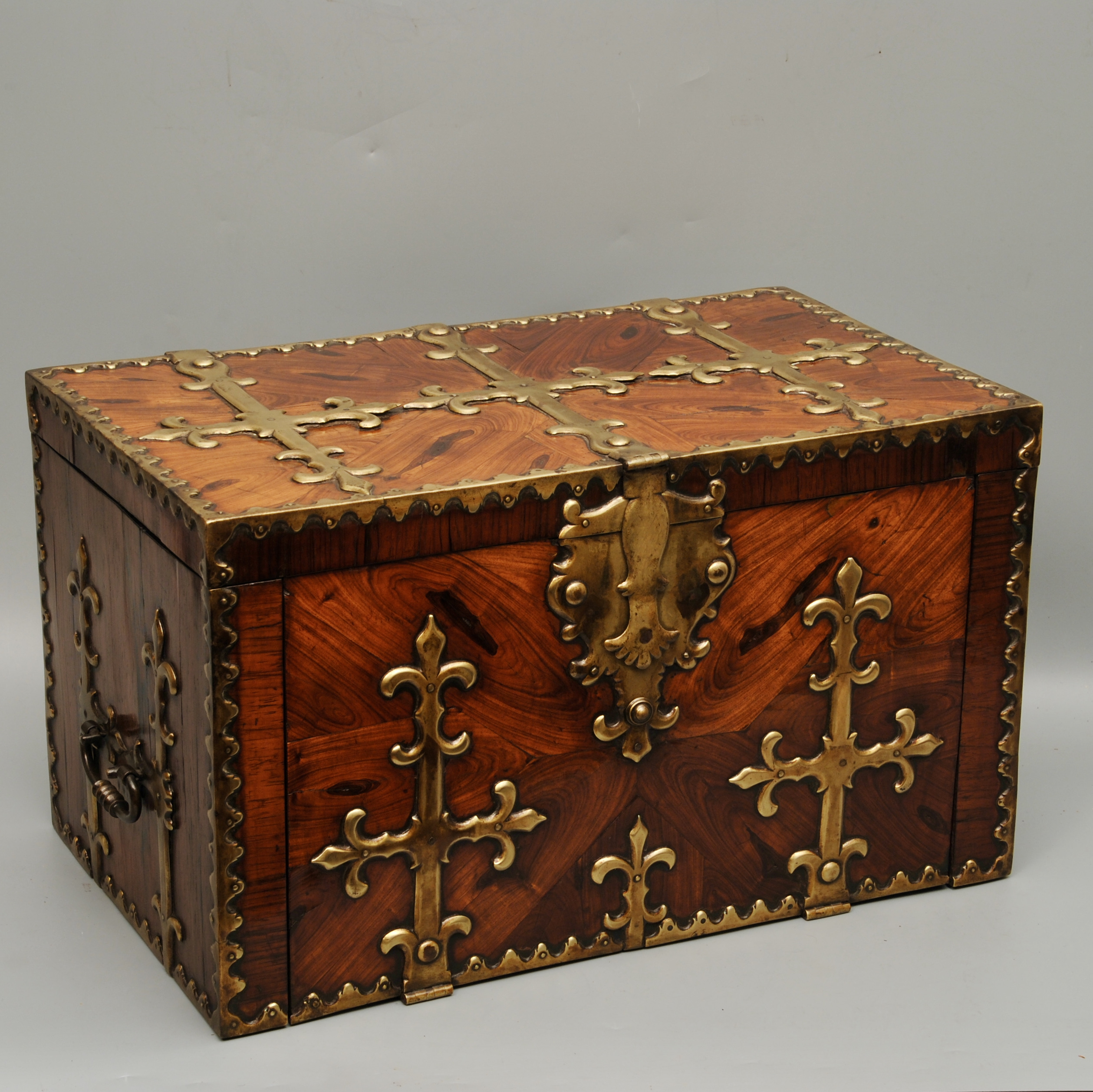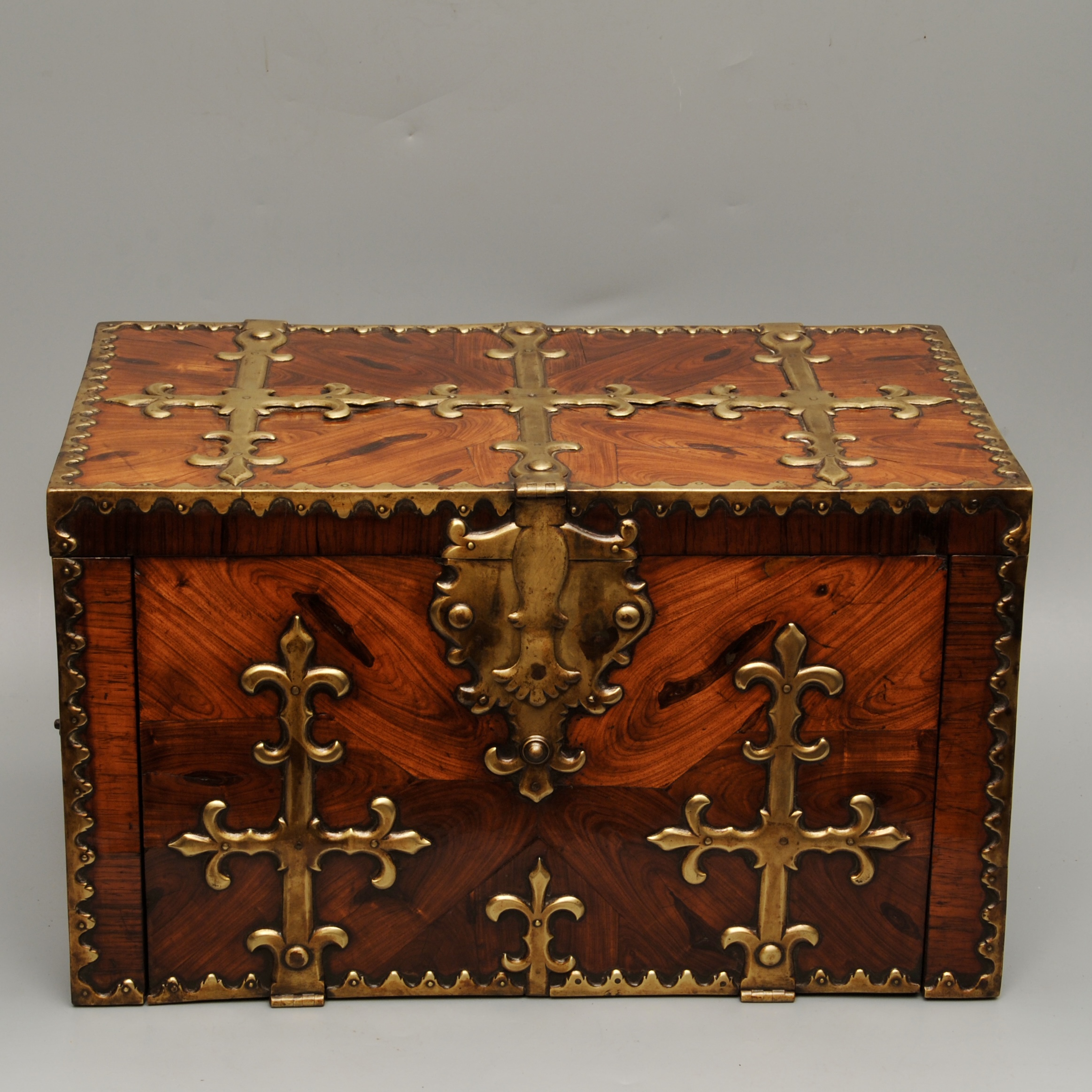 An early 18th century kingwood and brass mounted coffre fort, the fall front opening to reveal fitted drawers and several secret compartments. Good original fleur de lis brass mounts