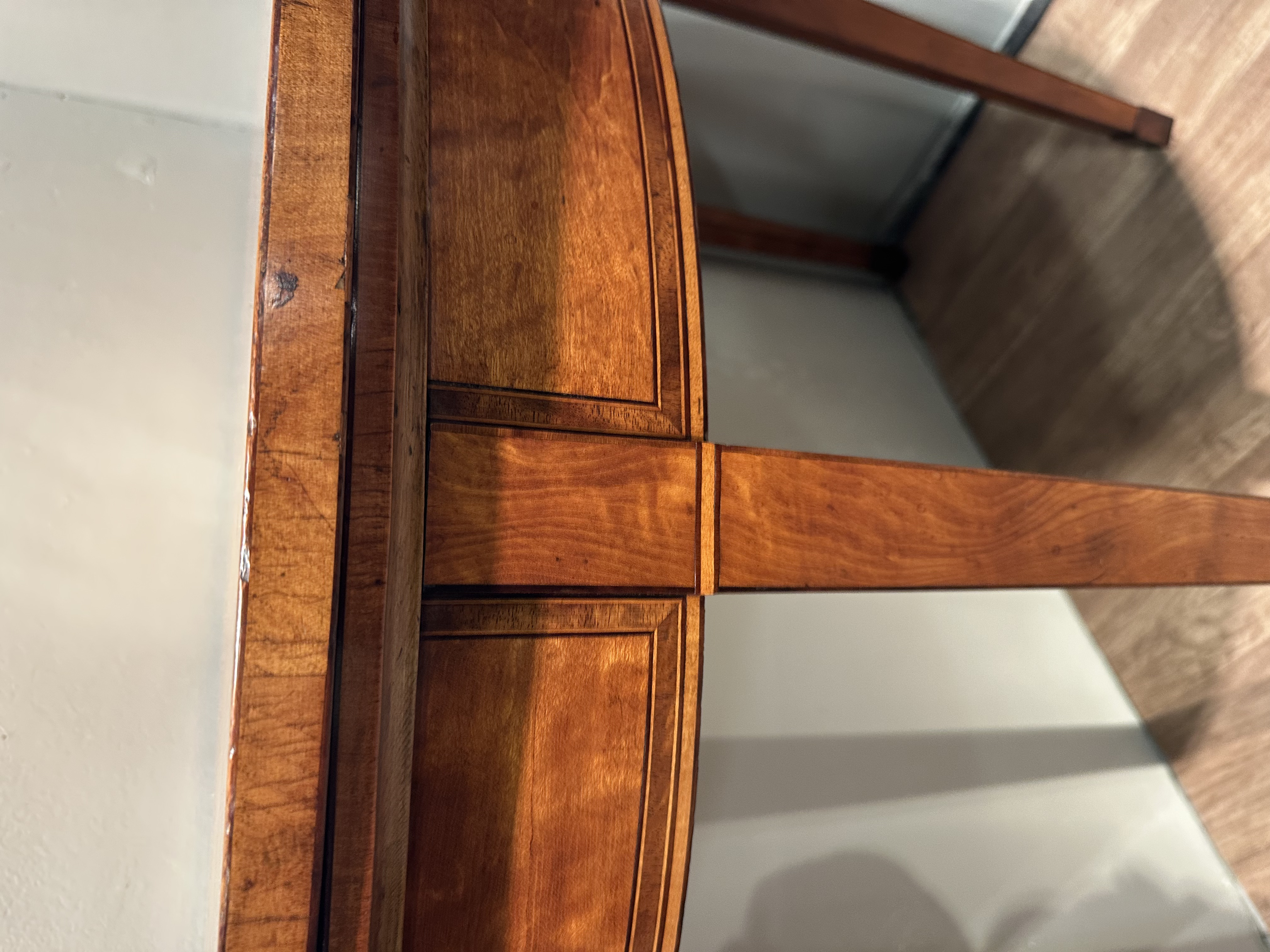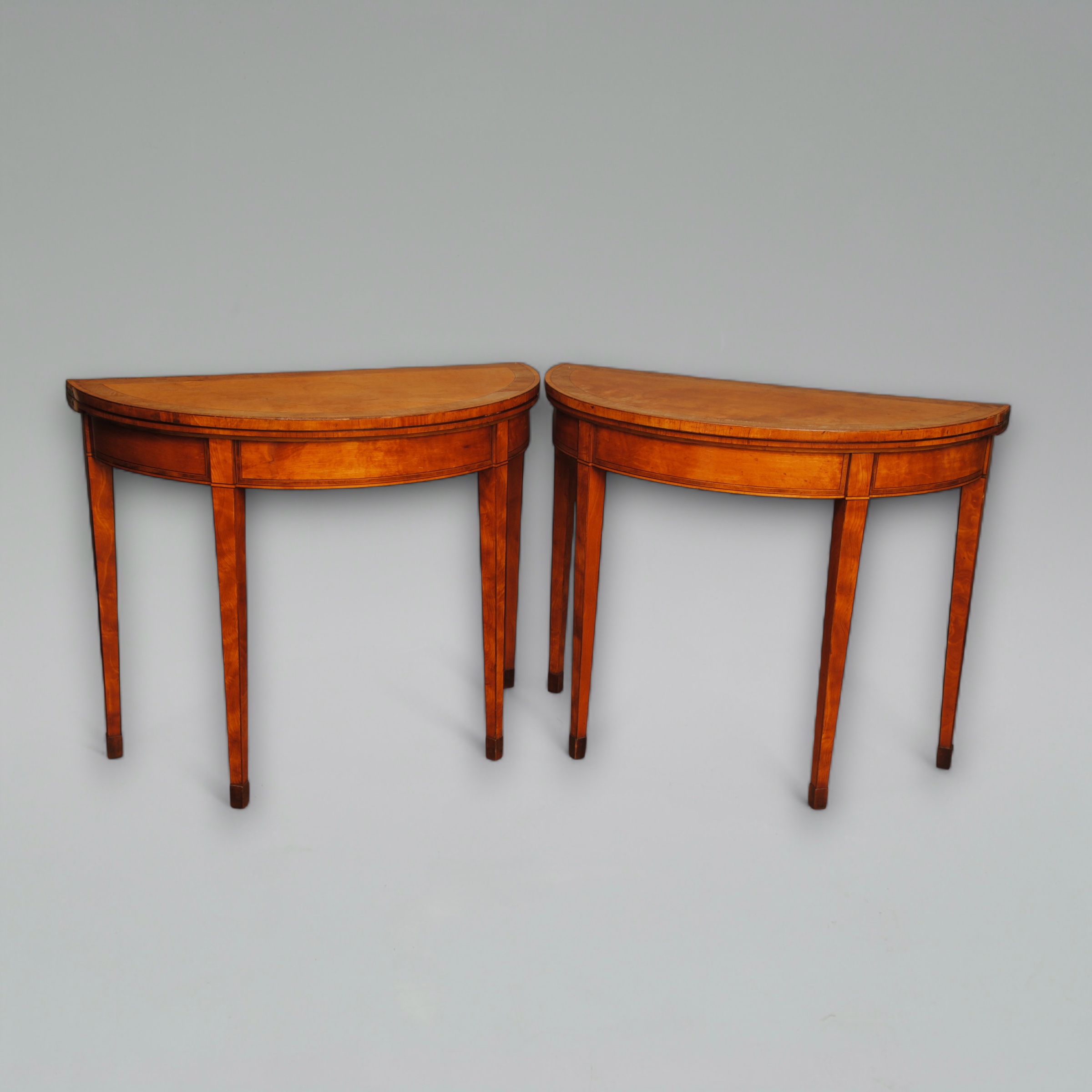 A pair of late 18th century satinwood demilune card tables with cross-banded tops and friezes on square tapering legs, good colour and patiation