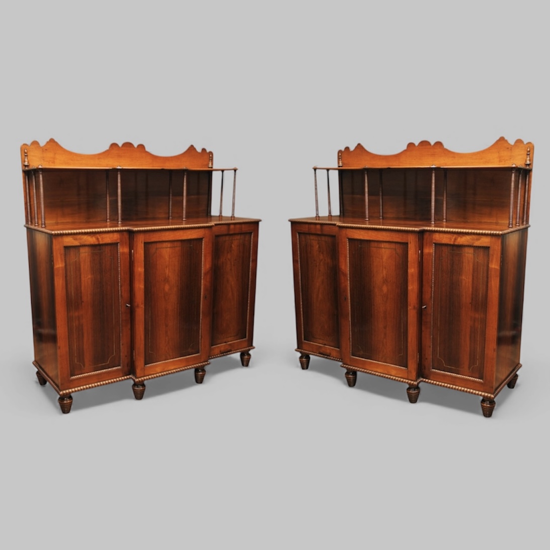 A pair of regency period rosewood and brass inlaid breakfront side cabinets with carved mouldings and turned supports to the top shelves