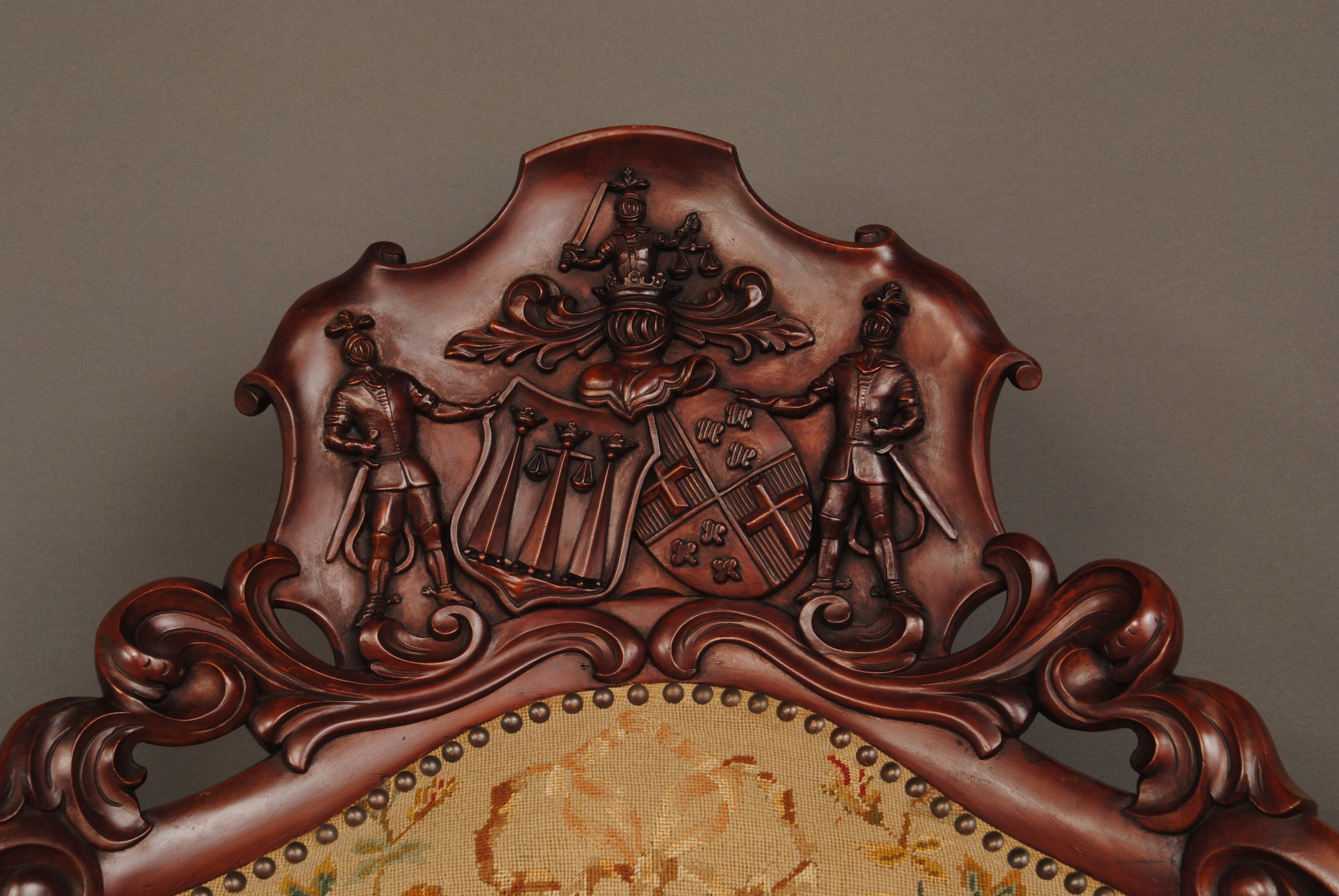 A fine victorian mahogany carved armchair of large scale with a wonderful carved coat of arms to the top rail.