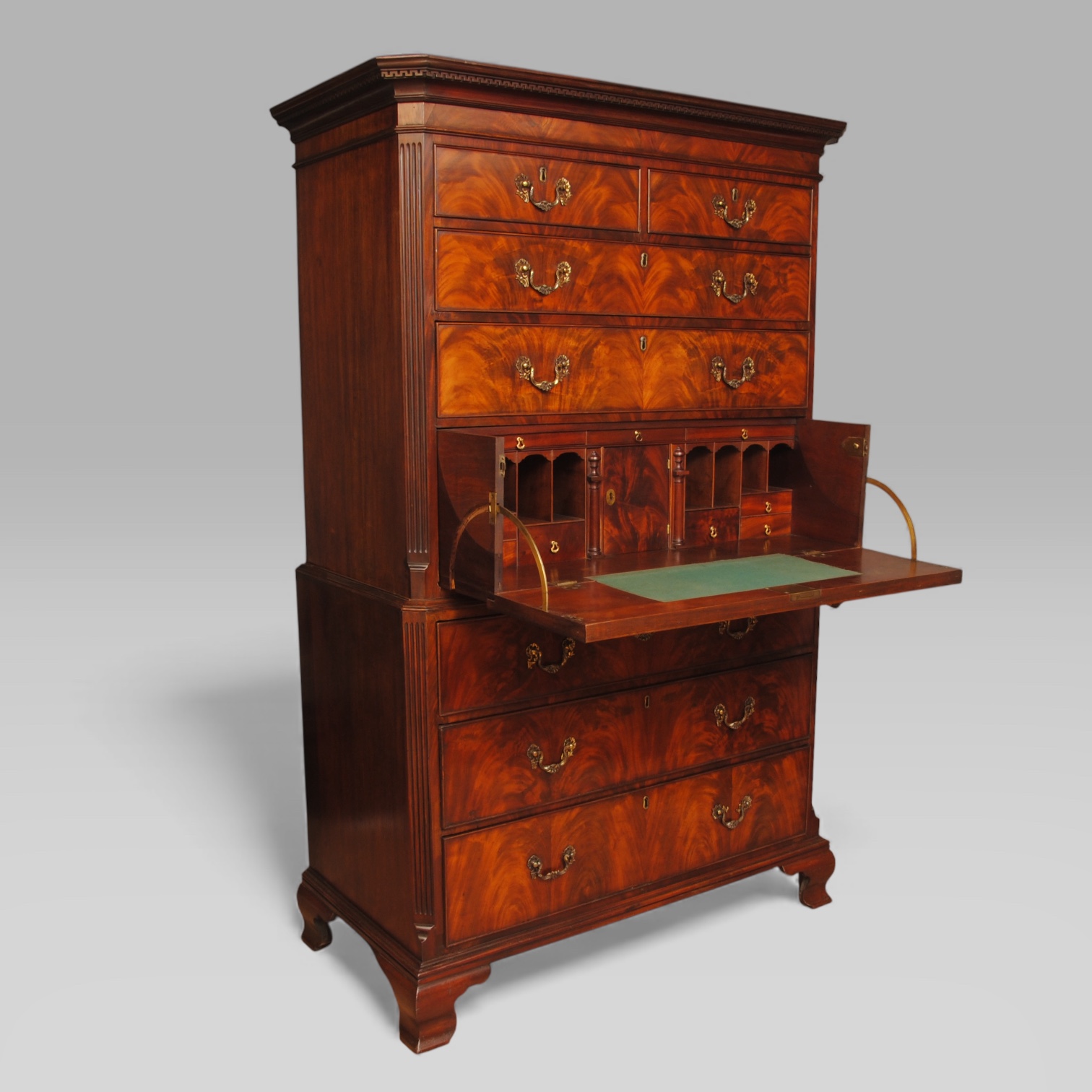 A fine example of an 18th century flame mahogany chest on chest with canted corners and ogee bracket feet.