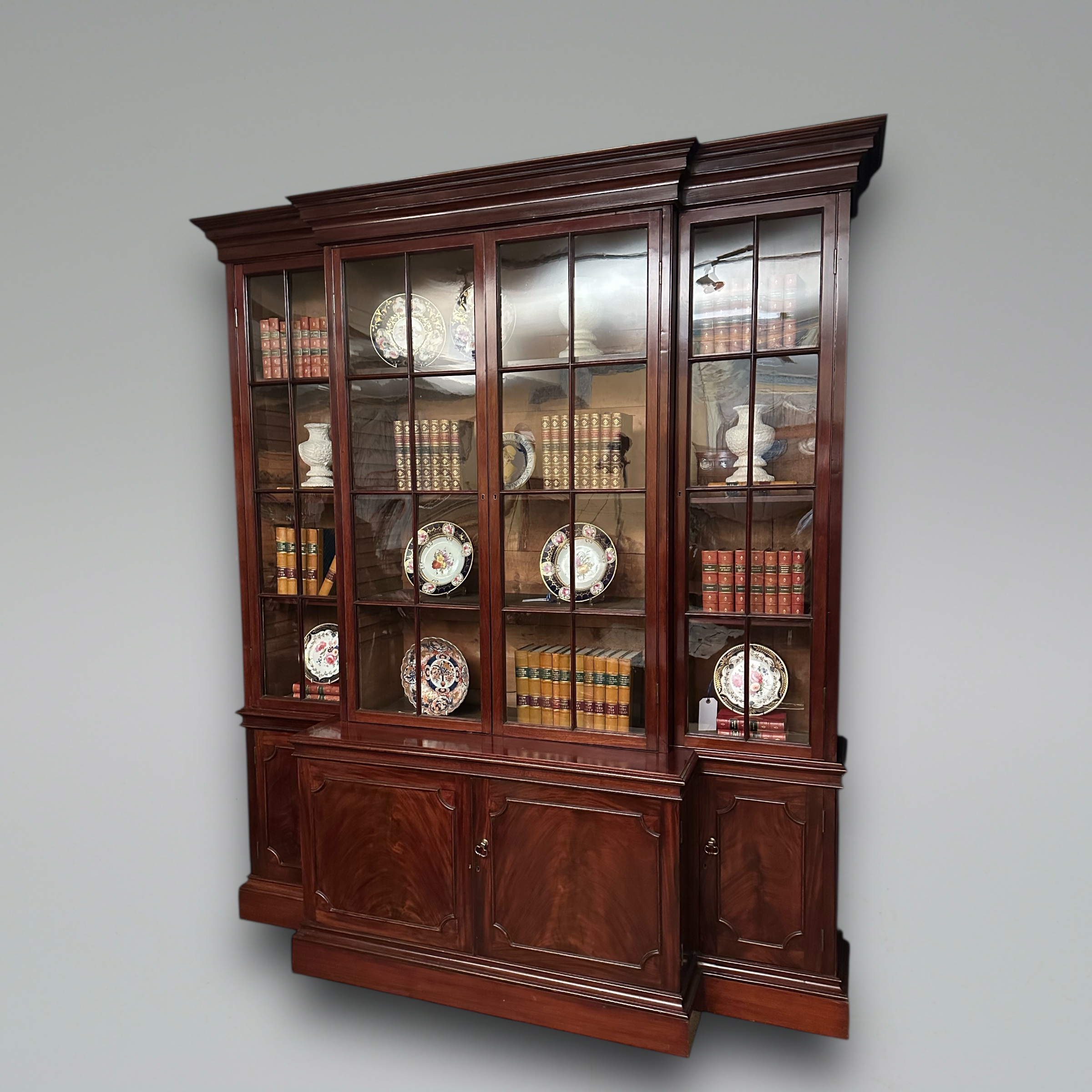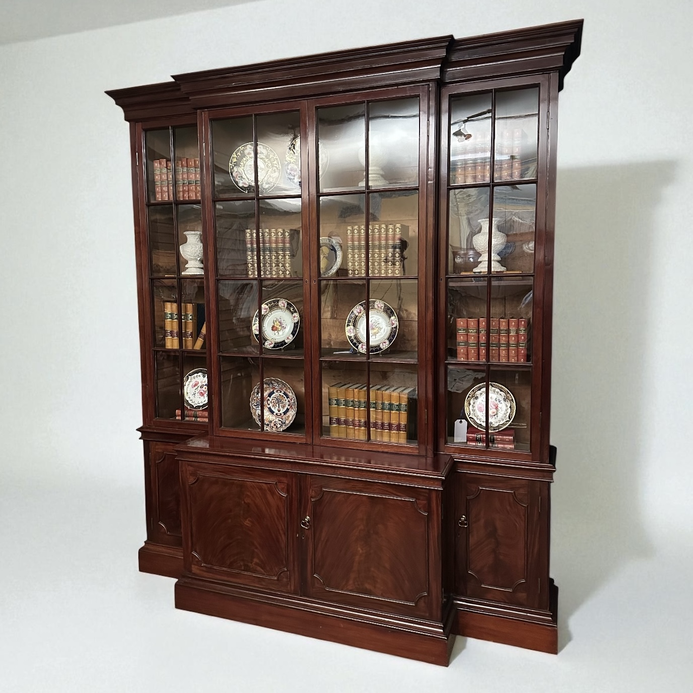 a George III mahogany breakfront bookcase with gazed top section and a low waist with flame mahogany panels below.