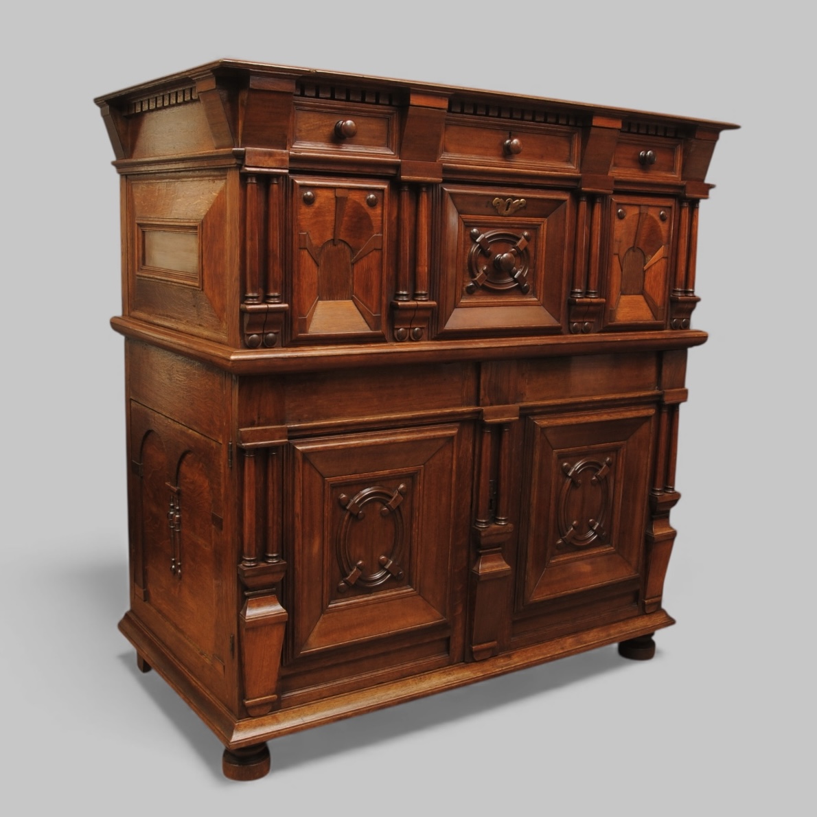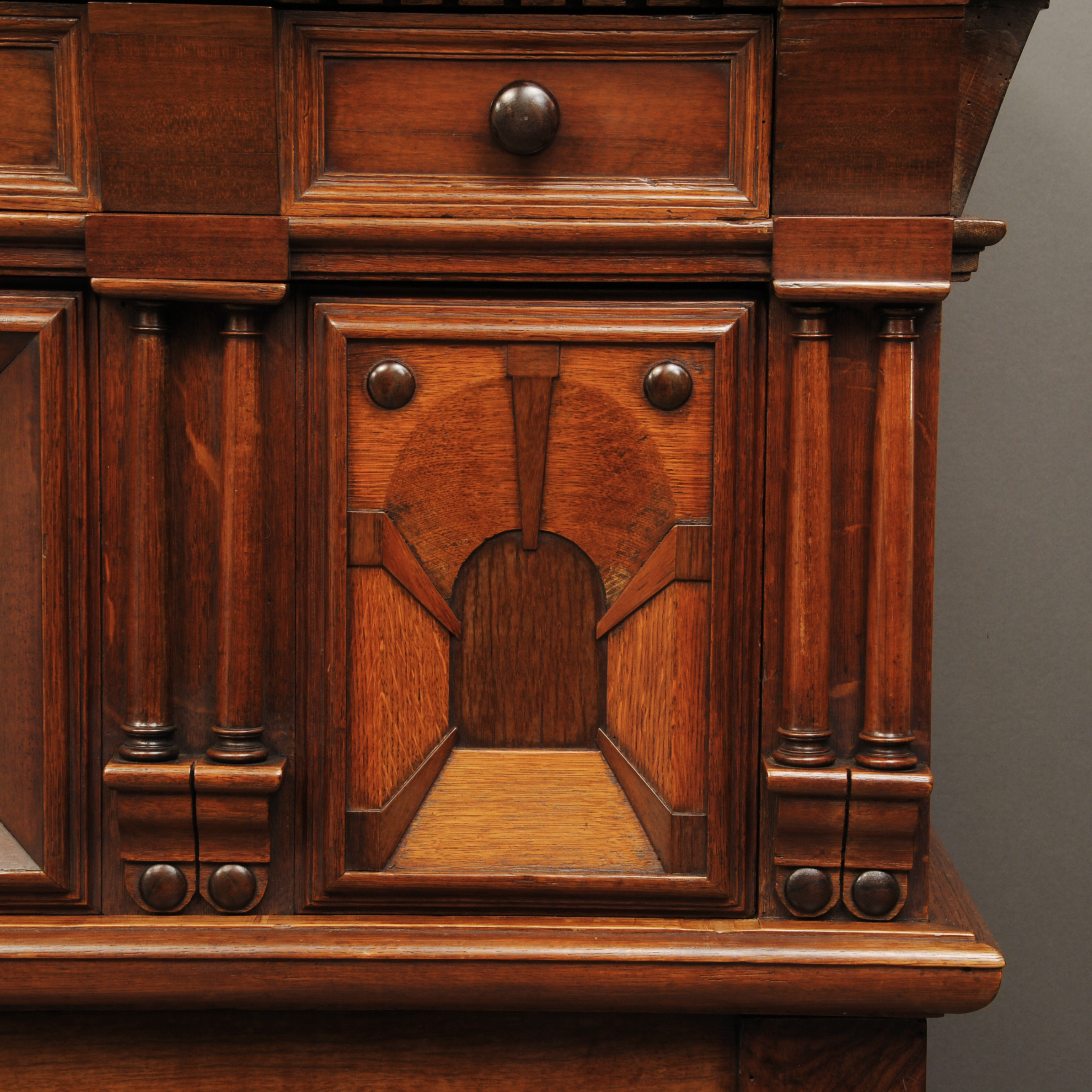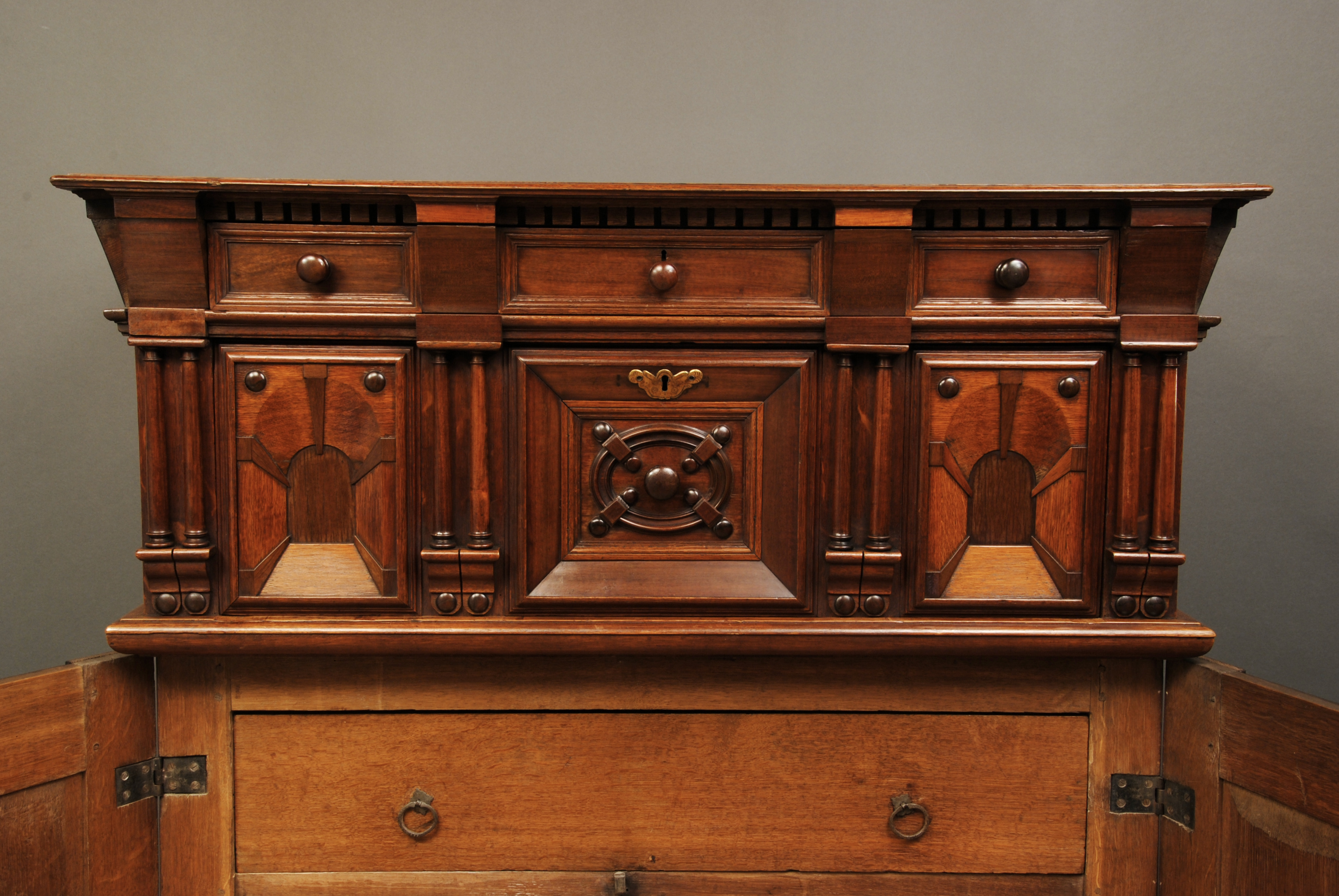 A fine late 17th century fitted oak, walnut, and fruit wood chest. The drawer and cupboard fronts with columns and architectural designs. the drawers open to show three fitted drawers. Circa 1695