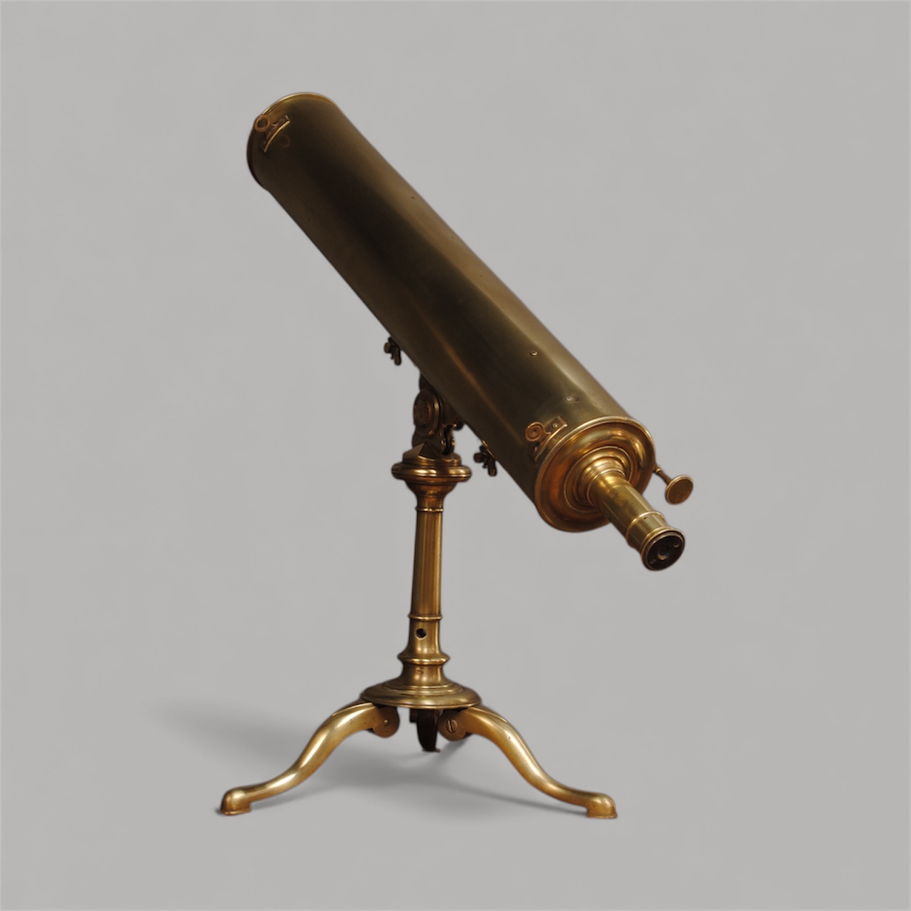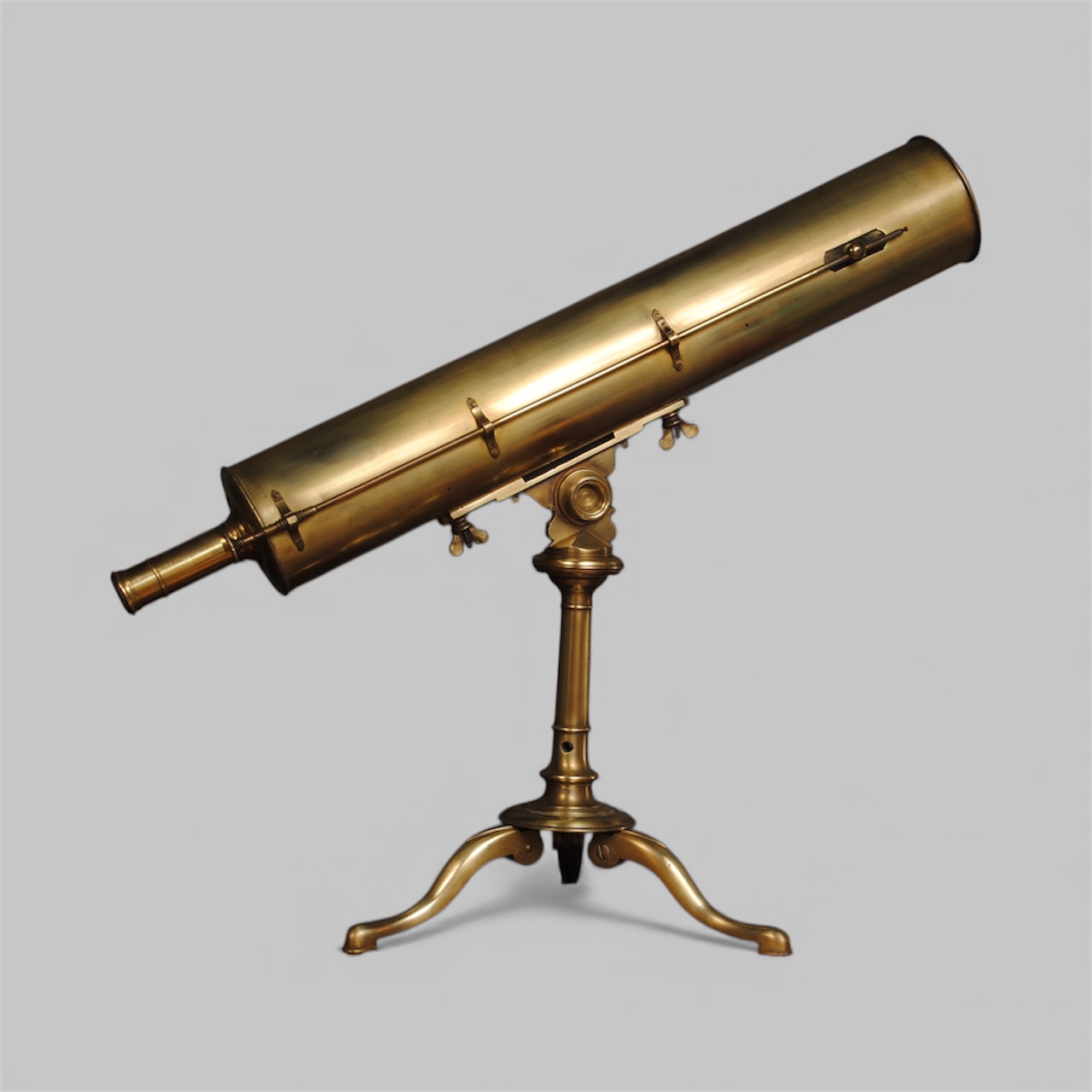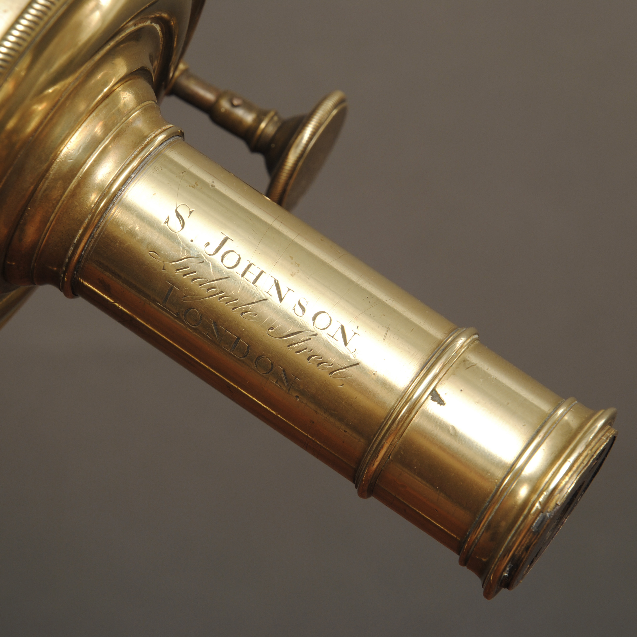 An 18th century 4″ diameter telescope of large scale with original tripod base signed on the eye piece by S Johnson, Ludgate street, London