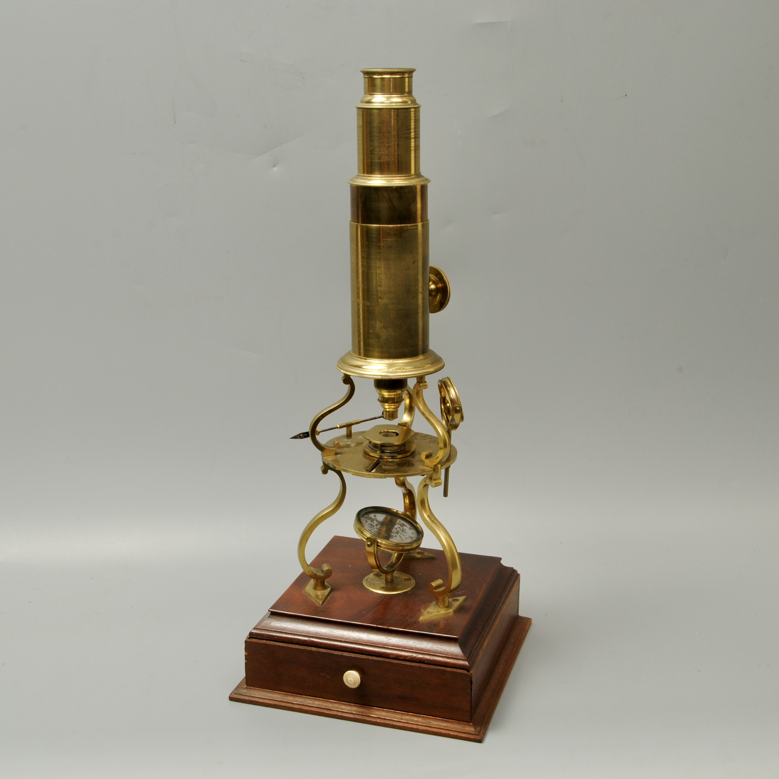 A good example of a late 18th century brass Culpeper microscope housed in its original mahogany case, with a pretty complete set of accessories and a leaflet and print