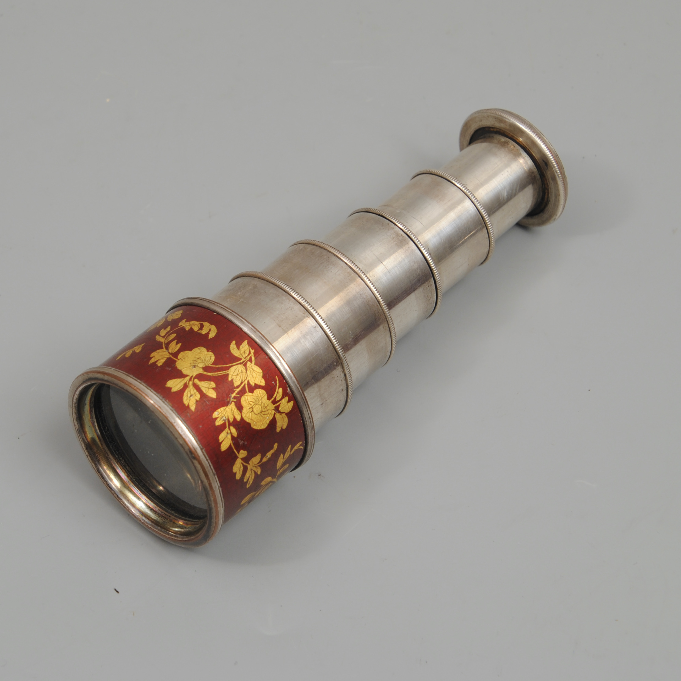 A smart silvered and red japanned monocular with gilt flowers in a re leather case