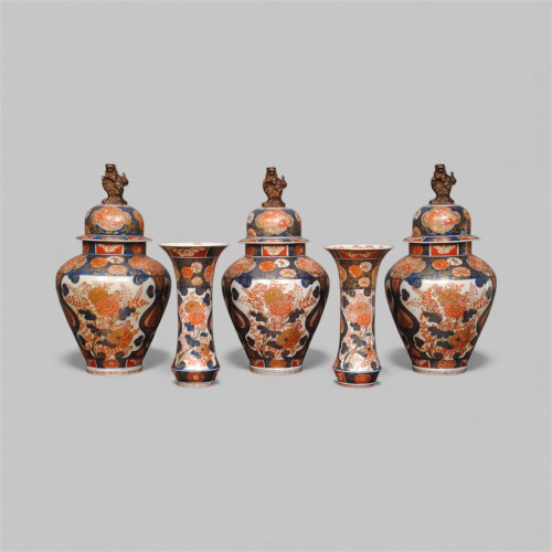 A decorative pair of 19th century Japanese Imari vases and covers decorated with flowers