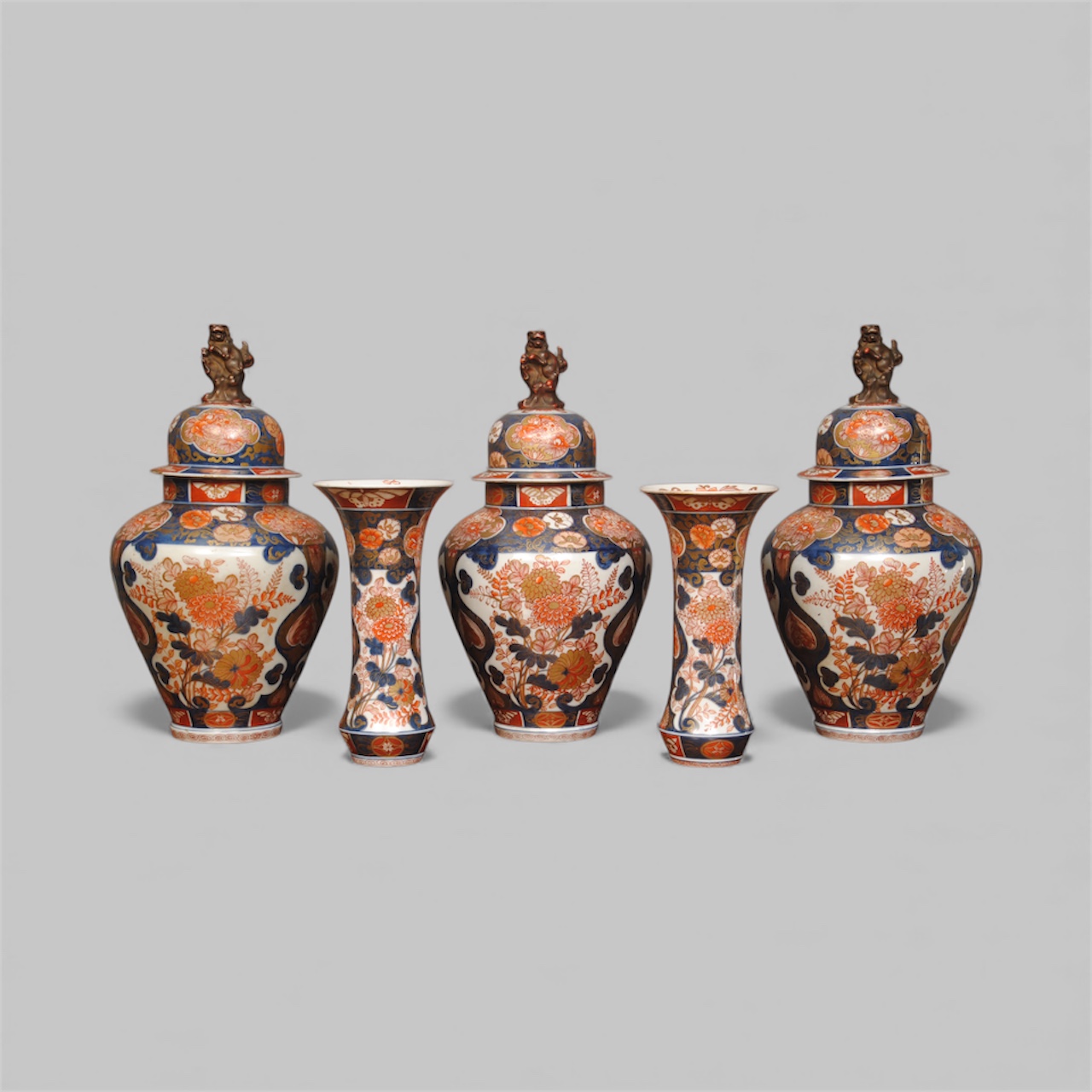 A good scale imari garniture with three baluster jars with lids and a pair of spill vases, Paris, late 19th century