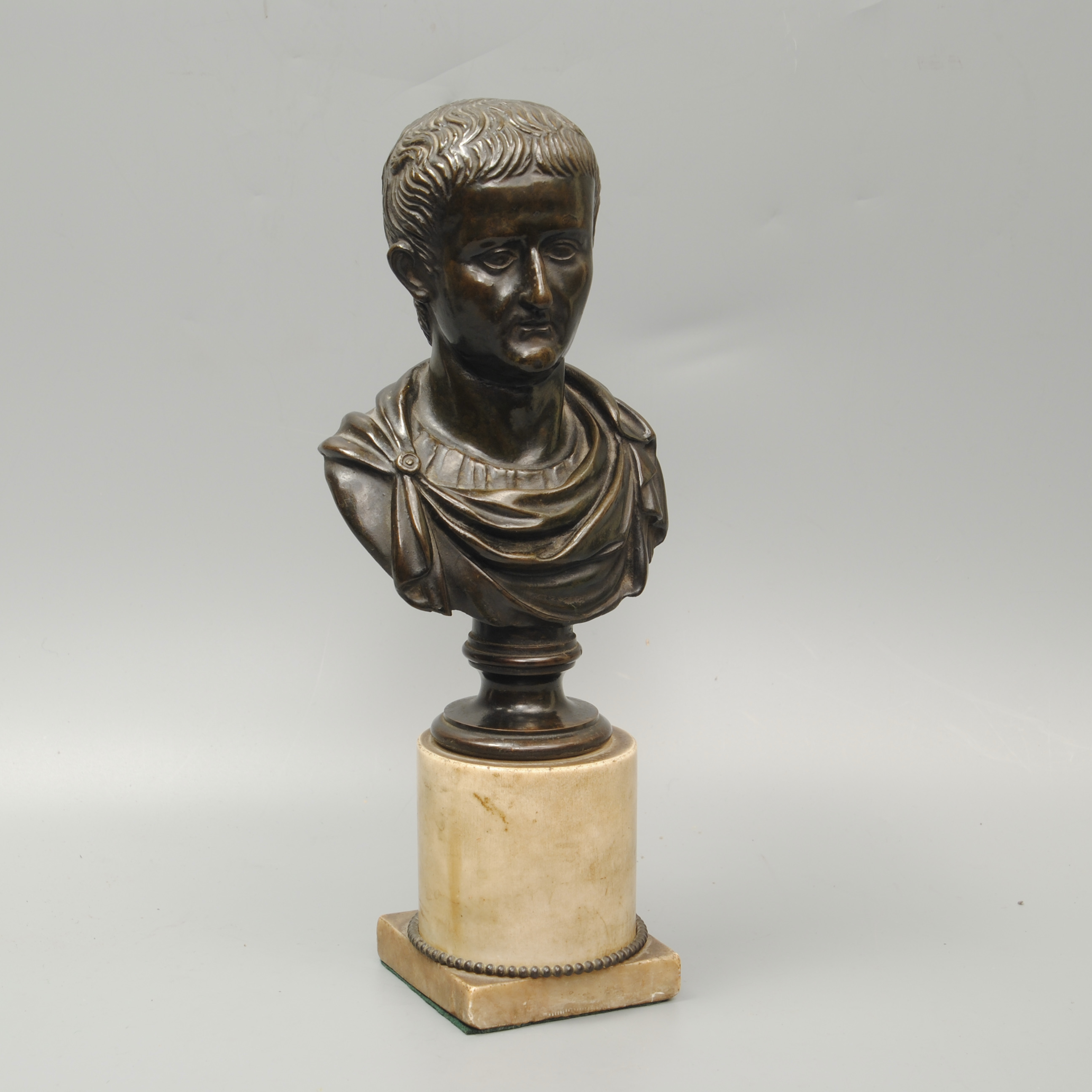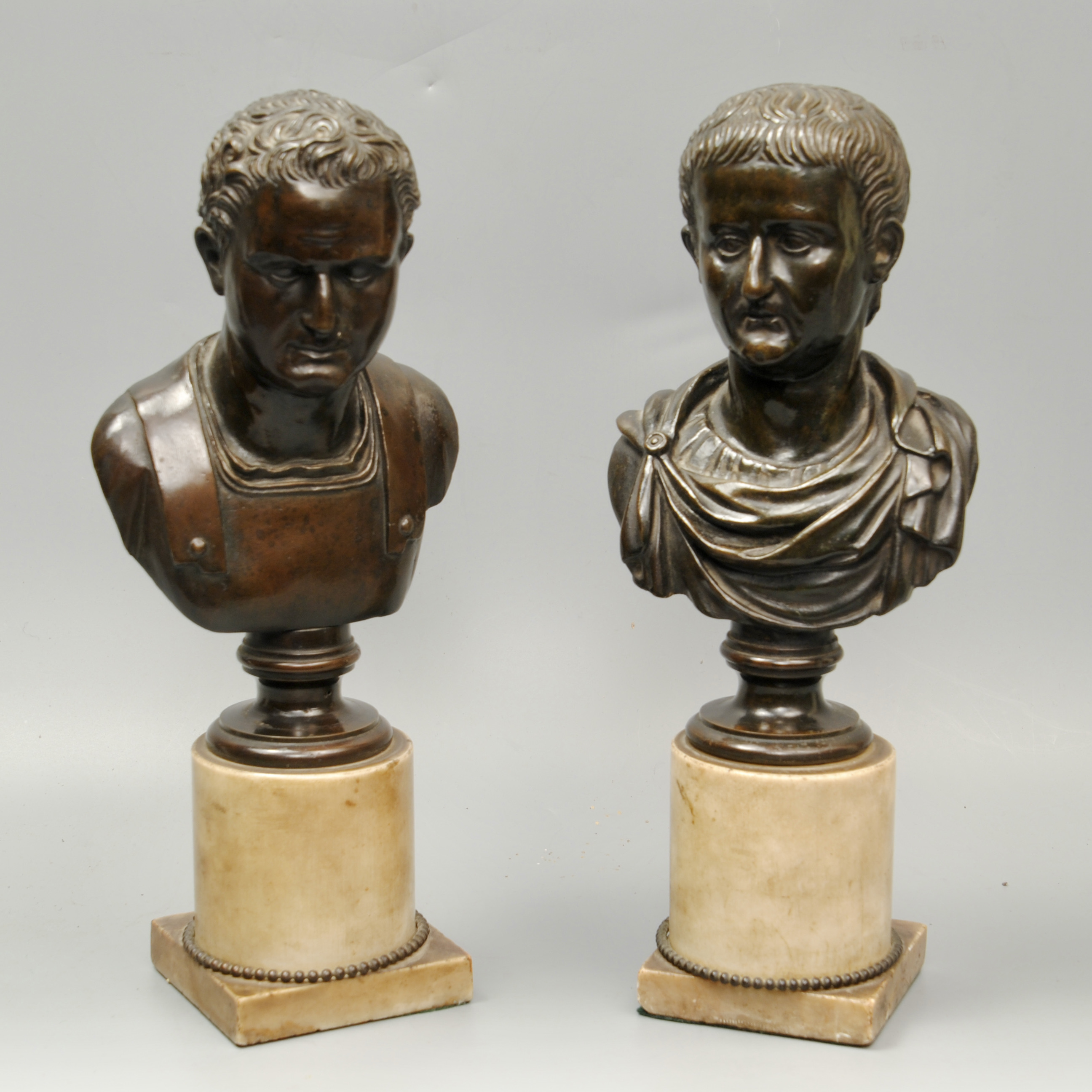 A pair of late 18th century Italian bronze busts of Roman emperors on the original white marble plinths