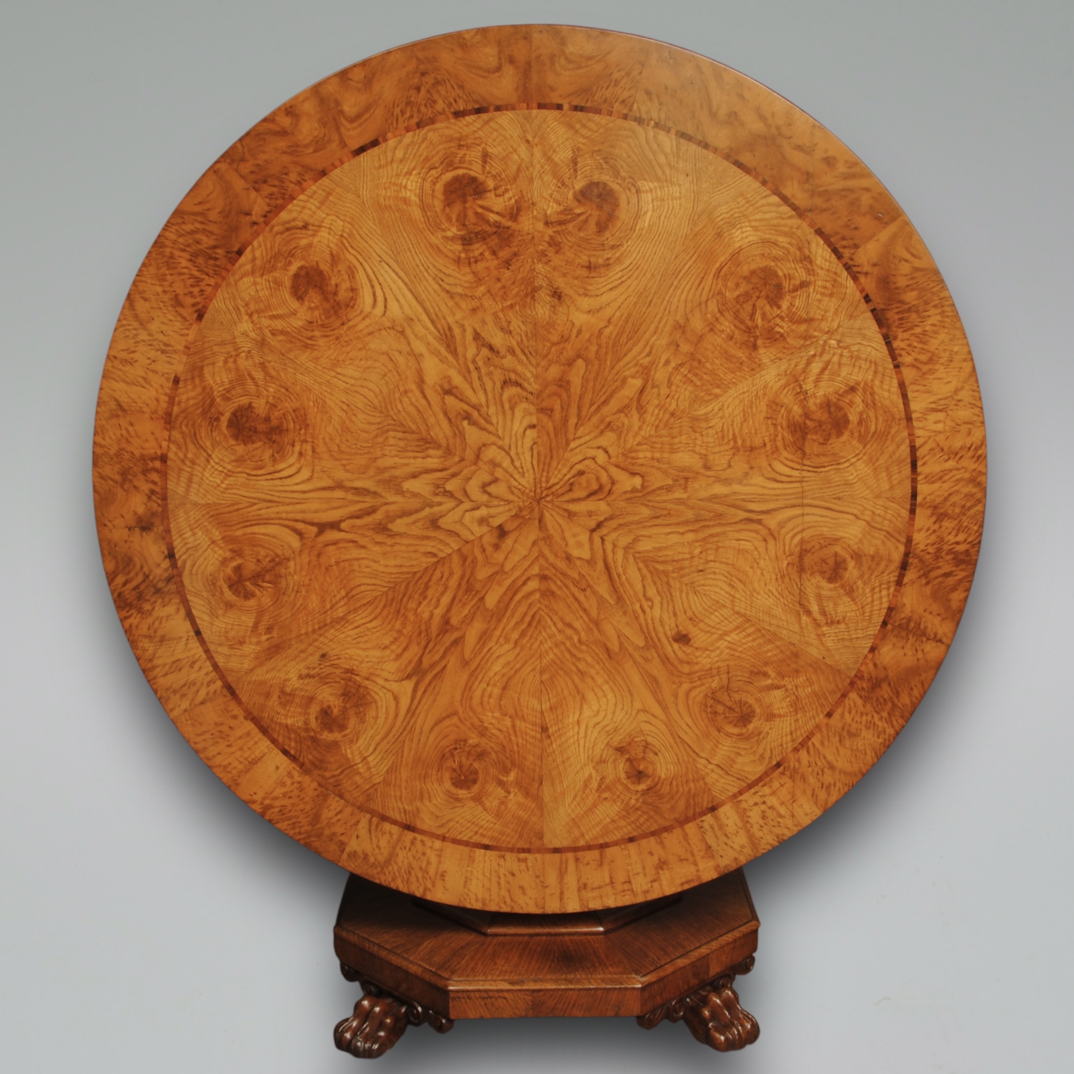 A William IV burr oak centre table, with a cross banded segmented top and an octagonal base with carved paw feet