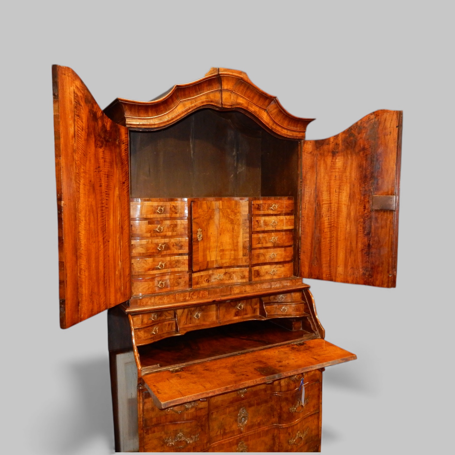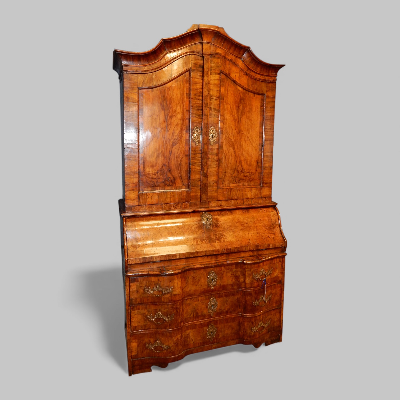 original Rococo brass handles to the three shaped drawers below the fall front.