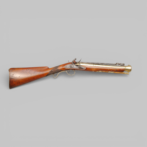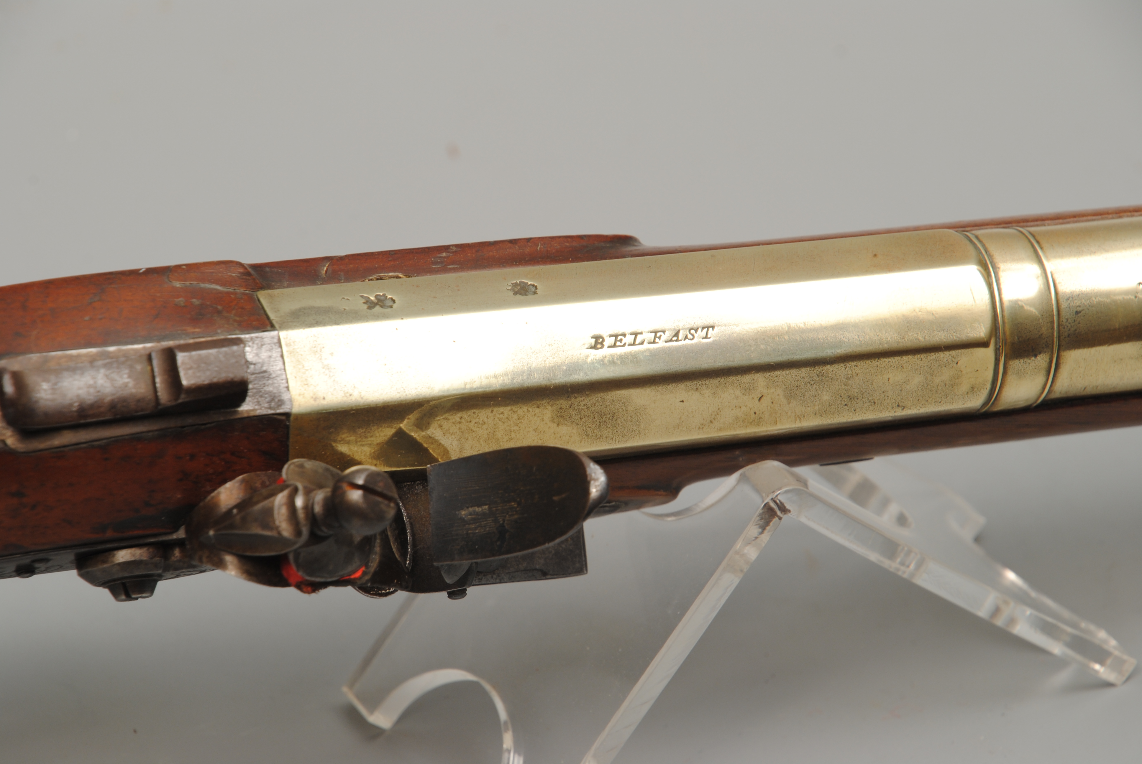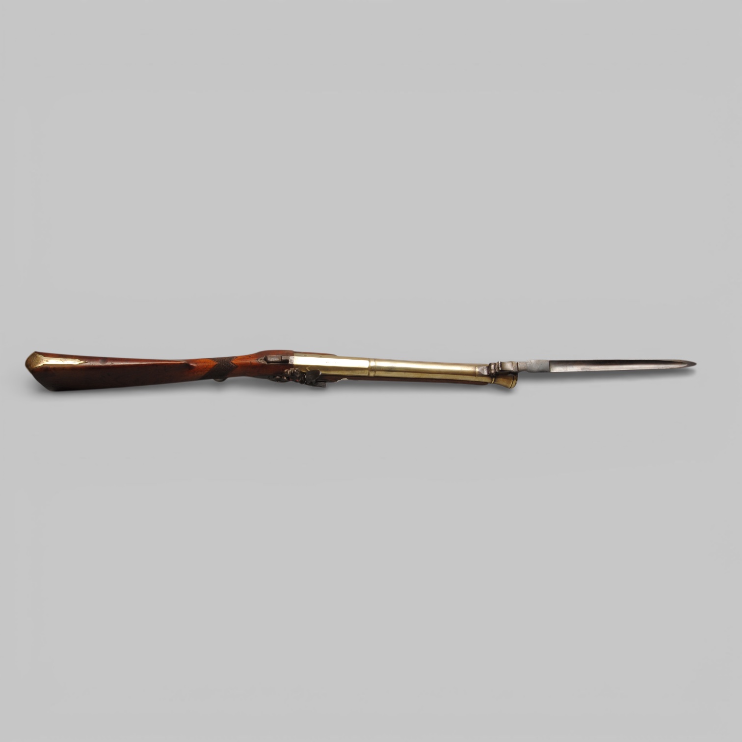 A good example of an Irish flintlock blunderbuss, with a three stage brass barrel mounted with a flick bayonet and walnut stock.